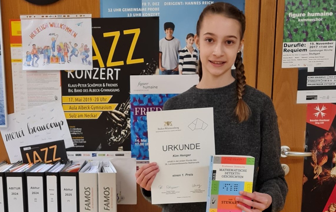 Wir gratulieren Kim Henger zur erfolgreichen Teilnahme am 38. Landeswettbewerb Mathematik Baden-Württemberg. Kim bekam für ihre Leistungen eine Urkunde und einen Buchpreis überreicht. Wir drücken die Daumen für die 2. Runde des Landeswettbewerbes, für die sich Kim hiermit qualifiziert hat.