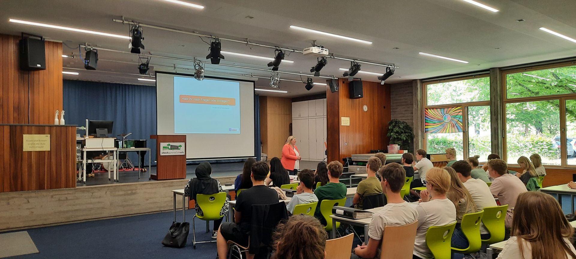 ZurückAm Montag, den 19.06.2023, besuchte uns 11.-Klässler die Bundestagsabgeordnete Maria-Lena Weiss (CDU), die für den Wahlkreis Rottweil-Tuttlingen zuständig ist. Somit bekamen wir einen realitätsnahen Einblick in das Leben eines Politikers/einer Politikerin.