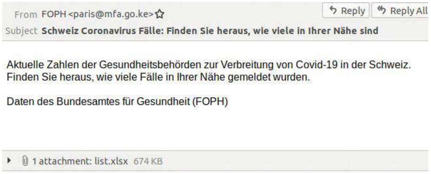 Zudem wurde festgestellt, dass jüngst zahlreiche Adressen mit Bezug zu Corona registriert worden sind. Ein Beispiel aus der Schweiz ist in dieser Hinsicht der Versuch, PCs mit der Schadsoftware "AgentTesla" zu infizieren. Die E-Mails geben vor, vom Bundesamt für öffentliche Gesundheit der Schweiz zu stammen.
