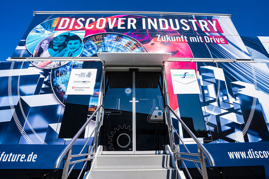 DISCOVER INDUSTRY räumt auf mit solchen Vorurteilen und beweist das Gegenteil: Das einzigartige Roadshow-Fahrzeug mit knapp 100 m² Ausstellungsfläche auf zwei Ebenen bringt die spannende Welt der Industrie direkt an Schulen in Baden Württemberg. Dabei zeigen zwei junge Coaches – eine Physikerin und ein Ingenieur – den Jugendlichen, wie vielfältig Ingenieur- und andere MINT-Berufe sein können, welche attraktiven Chancen sie bieten und wie dabei der Arbeitsalltag aussieht. Und das ist alles andere als langweilig!