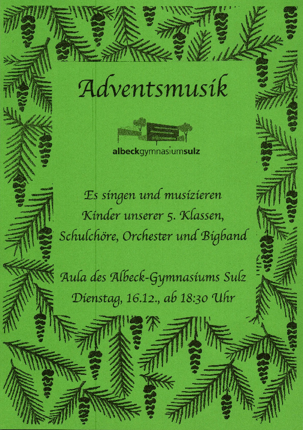 ZurückMusizierende Schülerinnen und Schüler laden zur Adventsmusik am Dienstag, 16.12.2025, ab 18:30 Uhr in die Aula des Albeck-Gymnasiums ein. Mit einem höchst abwechslungsreichen Programm werden mehr als hundert Mitwirkende weihnachtliche Stimmung in die Aula zaubern und die Zuhörerschaft erfreuen. Das Orchester, die Bigband und die Rockband werden mit Jazz-Pop-Standards sowie mit traditionellen Liedern auf Weihnachten einstimmen. Die beiden Preisträger des Lesewettbewerbs werden den Abend mit weihnachtlichen Gedichten bereichern. Dass sich die AGS-Schülerinnen und Schüler für das Singen im Musikunterricht sowie in schulischen Ensembles begeistern, wird mit Chorbeiträgen aus dem Kursstufenunterricht, mit den seit Herbst 2025 erarbeiteten Liedern unserer drei Fünfer-Gesangsklassen sowie mit den Voices zu hören sein. Bei einem gemeinsamen Schlusslied können alle Besucherinnen und Besucher selbst in die weihnachtlichen Klänge eintauchen. Wir freuen uns auf zahlreiche Besucher und bestuhlen dafür extra Aula und Mehrzweckraum, so dass genügend Plätze für die Schulgemeinschaft sowie für Gäste zur Verfügung stehen. Im Anschluss an das Konzert gibt es die Möglichkeit zum Austausch und zur Begegnung bei Punsch und begleitender Livemusik. Am Ende des Konzerts bitten wir um eine Spende zugunsten der Förderung musikalisch-kultureller Aktivitäten des Albeck-Gymnasiums.