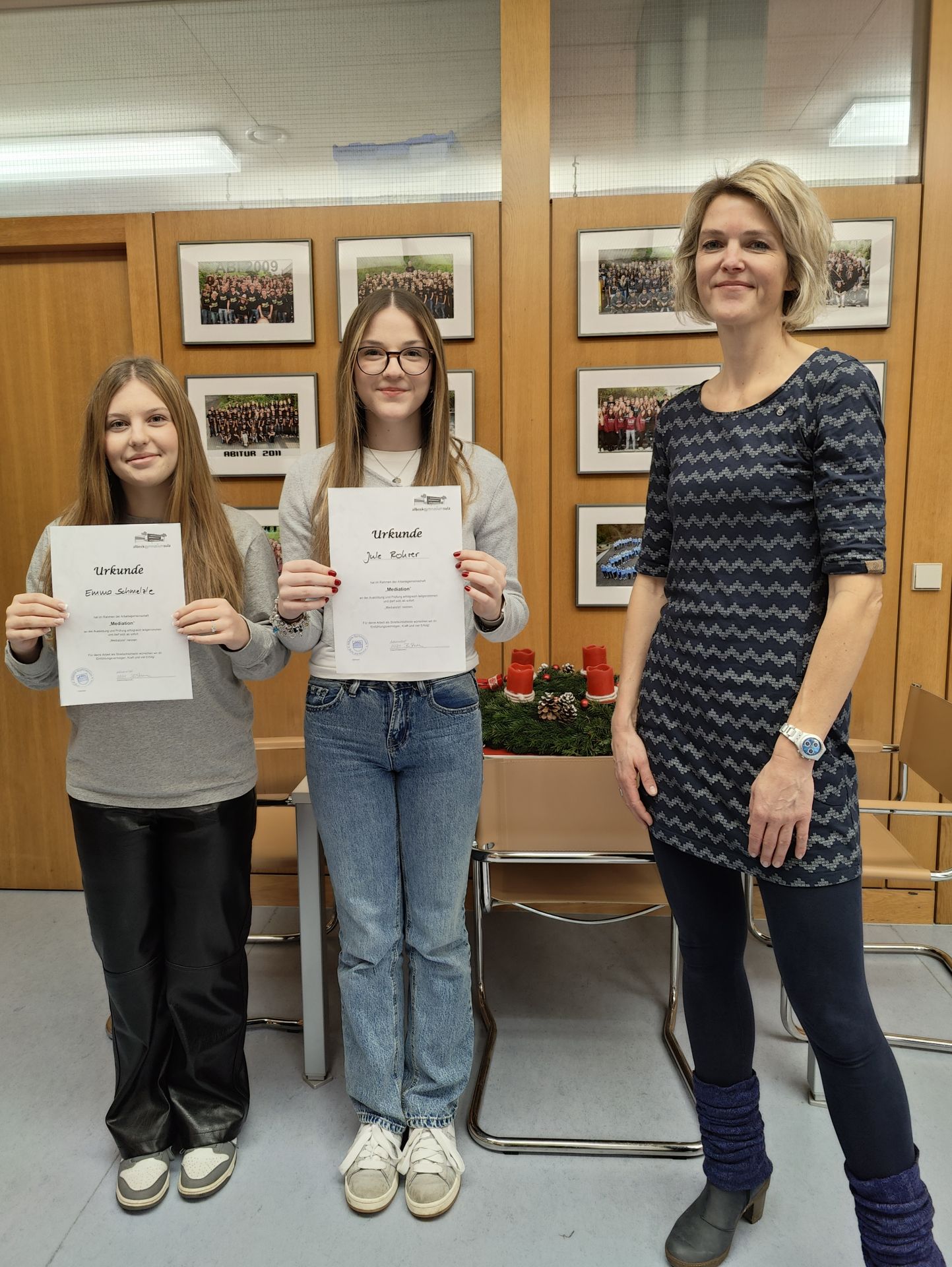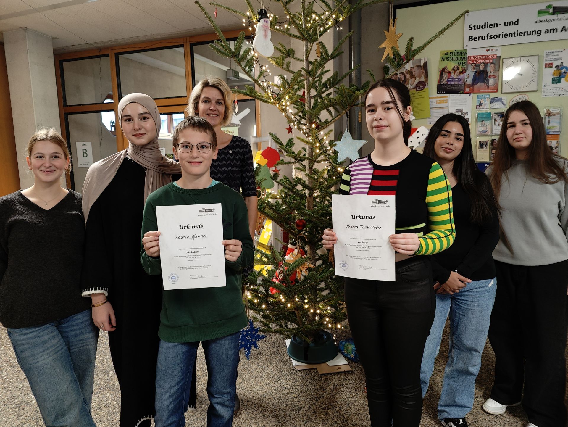 ZurückIm vergangenen Schuljahr haben 5 Schülerinnen und Schüler an der Mediatorenausbildung teilgenommen. Nach den letzten, erfolgreich absolvierten Nachprüfungen, wurde ihnen nun die Urkunde überreicht. Im Rahmen der AG Mediation, haben Laurin Günther (Klasse 7c), Medeea Dumitrache (Klasse 8b), Luna Faißt (Klasse 11a), Eda Ercan (Klasse 11a) und Ronja Schöne (Klasse 11a) an der Ausbildung und Prüfung erfolgreich teilgenommen. Als neue Mediatorinnen und Mediator verstärken sie ab jetzt das Team der Streitschlichter am Albeck Gymnasium. Eingebettet in die AG Mediation, stehen die Mediatorinnen und Mediatoren der gesamten Schulgemeinschaft zur Verfügung. Als unparteiische Dritte helfen und unterstützen sie bei der Konfliktlösung. Einen Termin bei der Streitschlichtung können die Kontrahenten entweder direkt mit den Streitschlichtern ausmachen oder sie kontaktieren Frau Sturm über die Dienstmailadresse: bettina.sturm [at] agsulz [dot] info