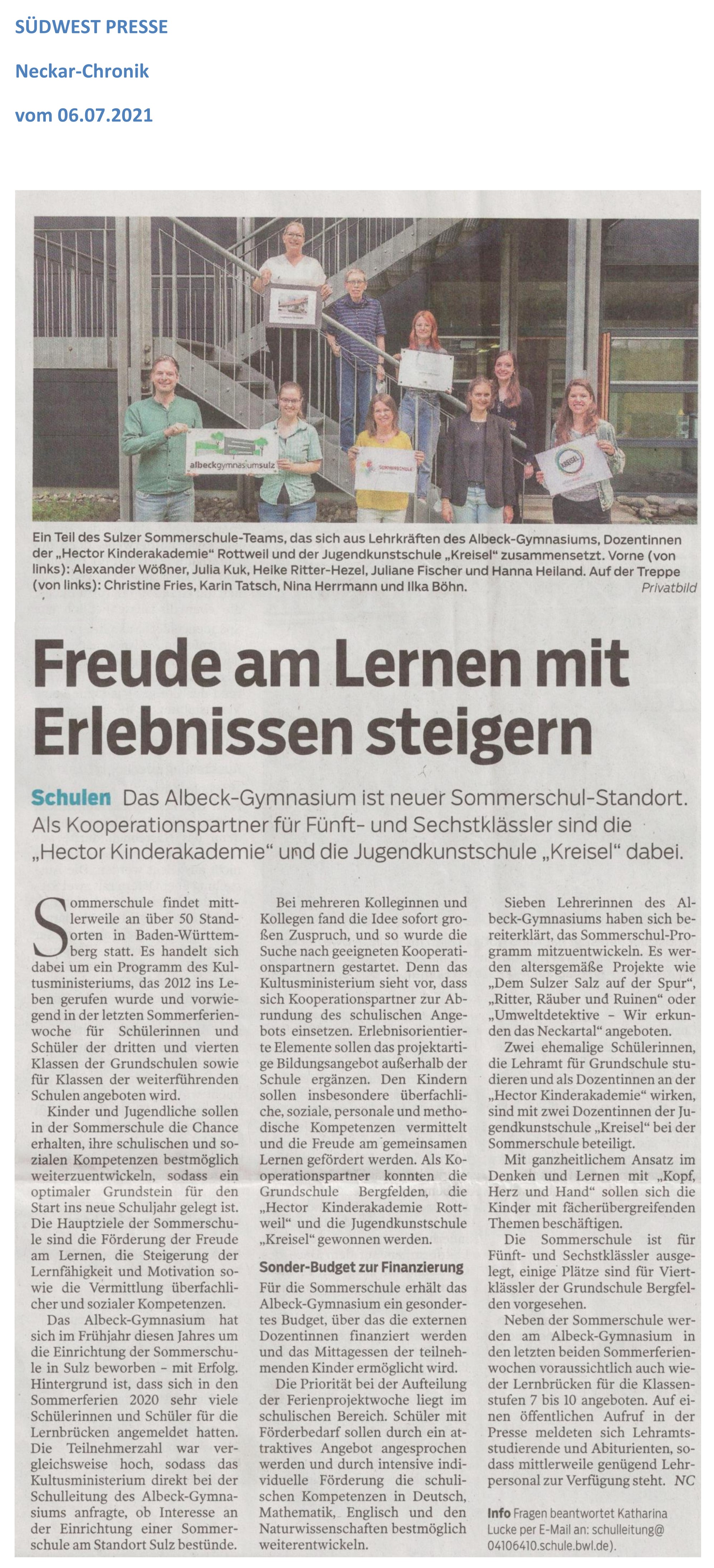 Freude am Lernen mit Erlebnissen steigern (Südwest Presse 06/07/2021)