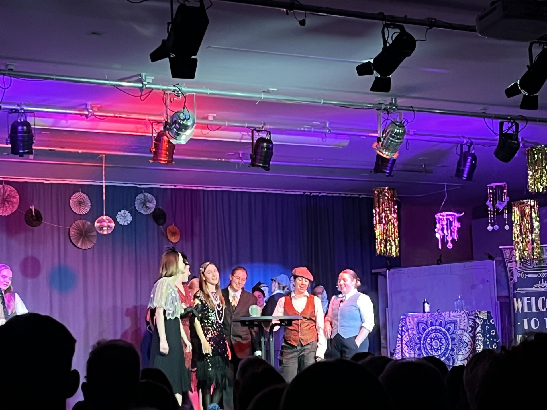 Schon beim Betreten der Aula fühlte man sich mitten in die schillernde Welt der Roaring Twenties versetzt. Goldene Akzente, opulente Deko und ein detailreich gestaltetes Bühnenbild ließen das Gefühl aufkommen, Jay Gatsby selbst könnte jeden Moment durchs Publikum stolzieren. Für Regie und die beeindruckende Kulisse war das Team aus Angjelina Berisha und Mia Haueisen verantwortlich, das die Aula kurzerhand in eine stilvolle Jazz-Age-Szenerie verwandelte.