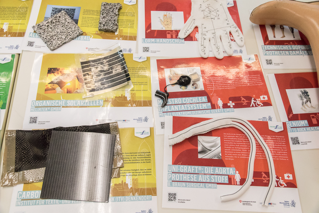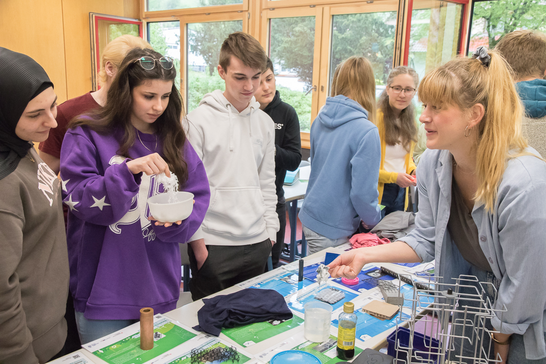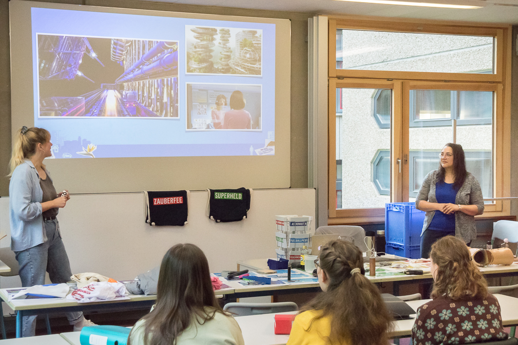 Genetikerin Dr. Simone Bauer und Chemikerin Katharina Prager ermöglichten Einblicke in verschiedene Zukunftsthemen. Die Auswahl reichte von Maschinen und Robotern über Wohnen und Mobilität der Zukunft bis hin zu Medizin, Lifestyle und Umweltschutz. Dazu präsentierten sie nicht nur spannende Vorträge mit Videos und Mitmach-Experimenten, sondern hatten auch jede Menge technische Exponate zum Anfassen und Ausprobieren dabei. Anhand der Beispiele erklärten sie anschaulich, was MINT-Berufe leisten und wie junge Leute darin an der Lösung wichtiger Zukunftsaufgaben mitarbeiten können.