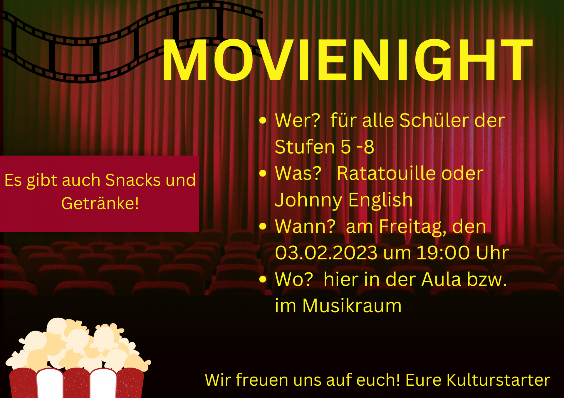 Die Jugendlichen entschieden sich, eine Movienight für die Klassen 5 bis 8 zu organisieren. In sorgfältiger Vorarbeit wurden Filme ausgewählt, Einladungen geschrieben, Plakate fürs Schulhaus (Abb. 1) gestaltet und aufgehängt. Ein kleiner Stolperstein, den die KulturStarter jedoch auch meisterten, waren die Fragen rund um das Thema Lizenz und Urheberrecht.