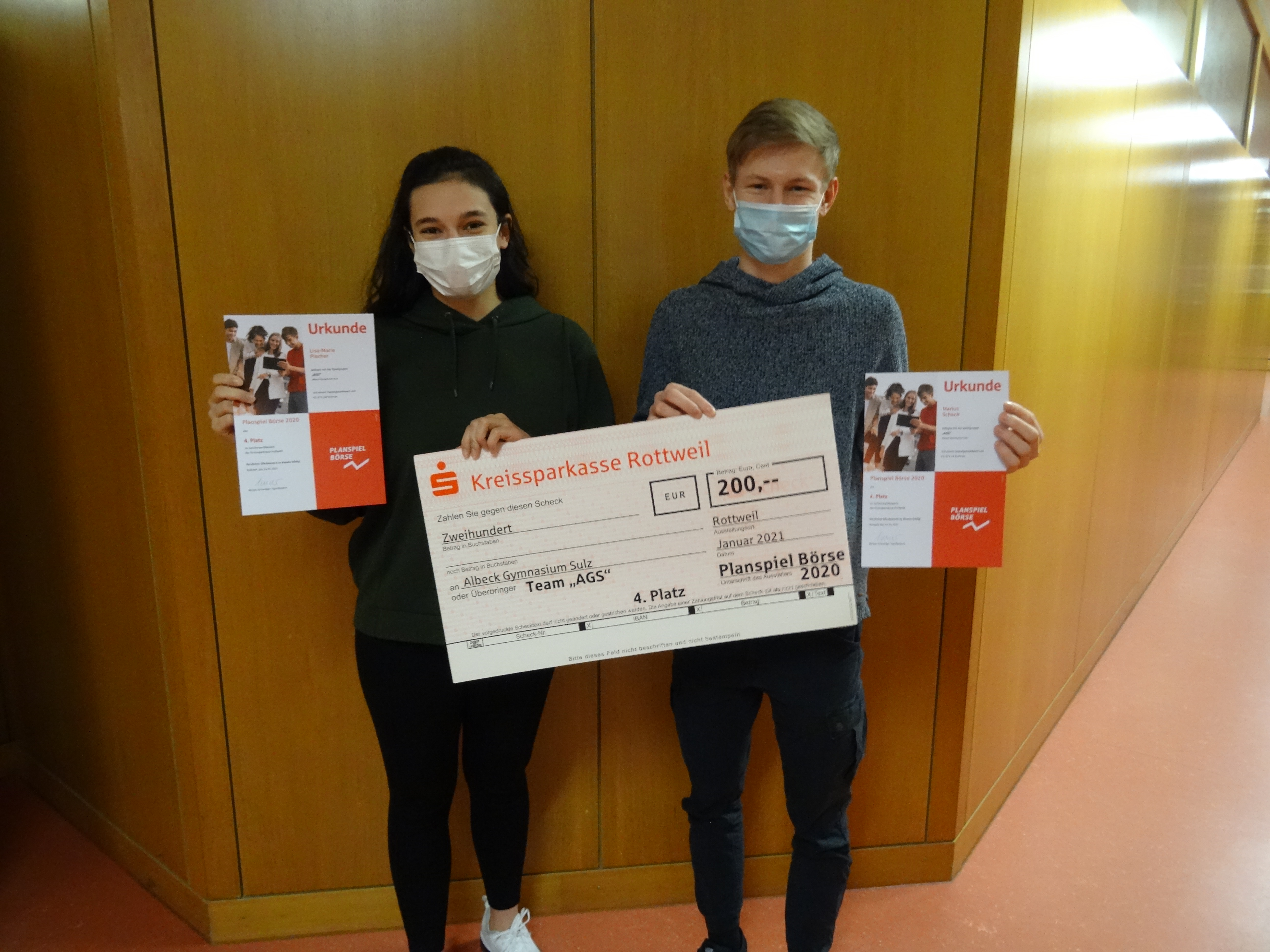 In einer knapp elfwöchigen Spielzeit versuchten sich Schülerinnen und Schüler des Albeck-Gymnasiums Sulz in dem von der Kreissparkasse Rottweil geförderten Online-Wettbewerb Planspiel Börse als Broker. Einige Spielgruppen konnten das virtuelle Anfangskapital von 50.000 € mit geschicktem Aktienhandel deutlich erhöhen. Das Team „AGS“ (Lisa-Marie Plocher und Marius Schenk) erreichte in der Depotgesamtwertung den 4. Platz und sicherte sich damit ein Preisgeld von 200 €. Herzlichen Glückwunsch!