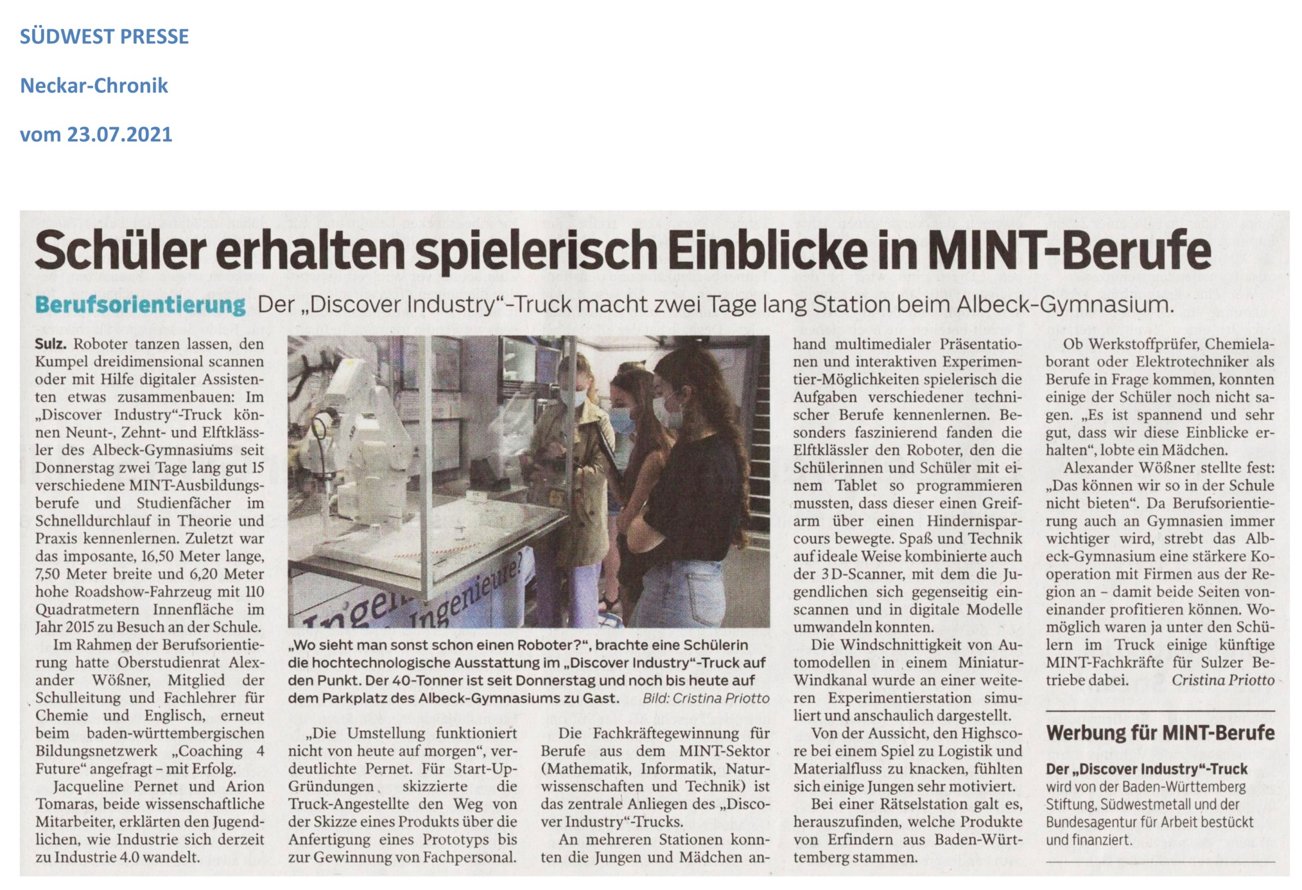 Schüler erhalten spielerisch Einblick in MINT-Berufe (Südwest Presse 23/07/2021)