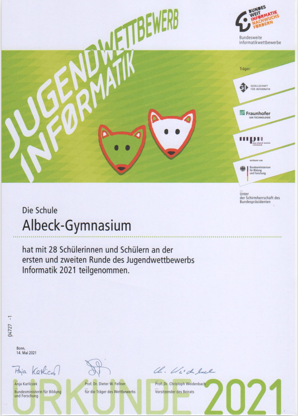 Achtundzwanzig Schüler des Albeck Gymnasiums haben an diesem Wettbewerb der Runde 1+2 teilgenommen und alle Teilnahmeurkunden erhalten.
