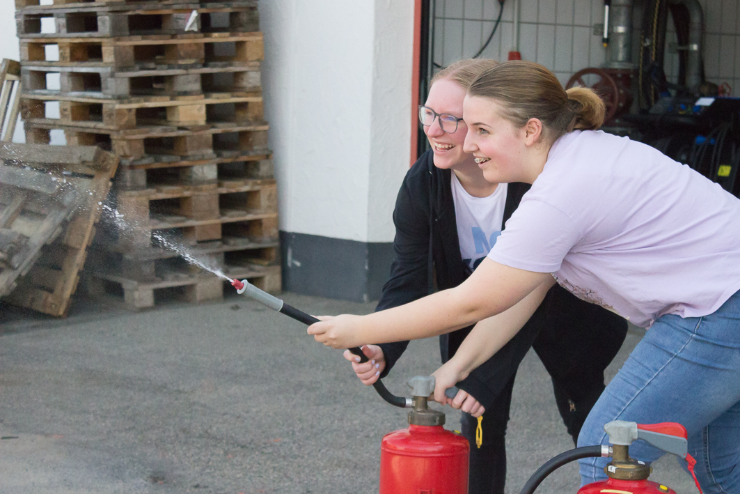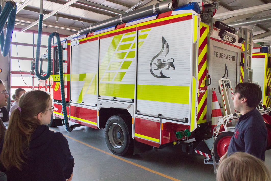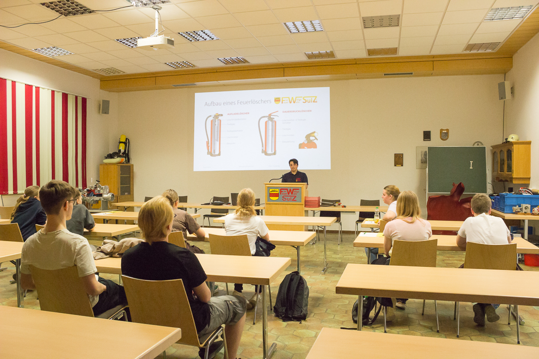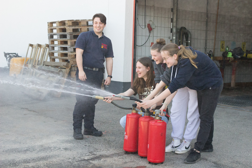 ZurückDieser Frage gingen die Schulsanitäterinnen und Schulsanitäter bei einer Exkursion zur örtlichen Feuerwehr auf den Grund. Los ging’s bei schönstem Frühlingswetter mit einem Fußmarsch nach Kastell, wo die freiwillige Feuerwehr ihren Standort hat. Dort wurde die Gruppe von Marc Trautewig empfangen. Der ehemalige Schüler des Albeck-Gymnasiums engagiert sich bereits seit einigen Jahren bei der Feuerwehr und ist als Atemschutzgeräteträger ausgebildet. In einem aufschlussreichen Vortrag führte er in die Grundlagen zur Brandentstehung und zum Löschen von Bränden ein. Im Anschluss daran konnte der beeindruckende Fuhrpark ausgiebig erkundet werden, wobei die Gruppe viel Spannendes zu den unterschiedlichen Geräten und deren Einsatzzweck erfuhr. Weitere Highlights waren schließlich die Besichtigung der Ausbildungs- und Trainingsanlagen sowie eine kleine Übung mit Handlöschern, die den Schulsanitäterinnen und Schulsanitätern sichtlich zu gefallen schien. Welch außerordentliche Arbeit die Rettungsdienste auch hier vor Ort in Sulz leisten, wurde bei dieser Exkursion sehr deutlich.