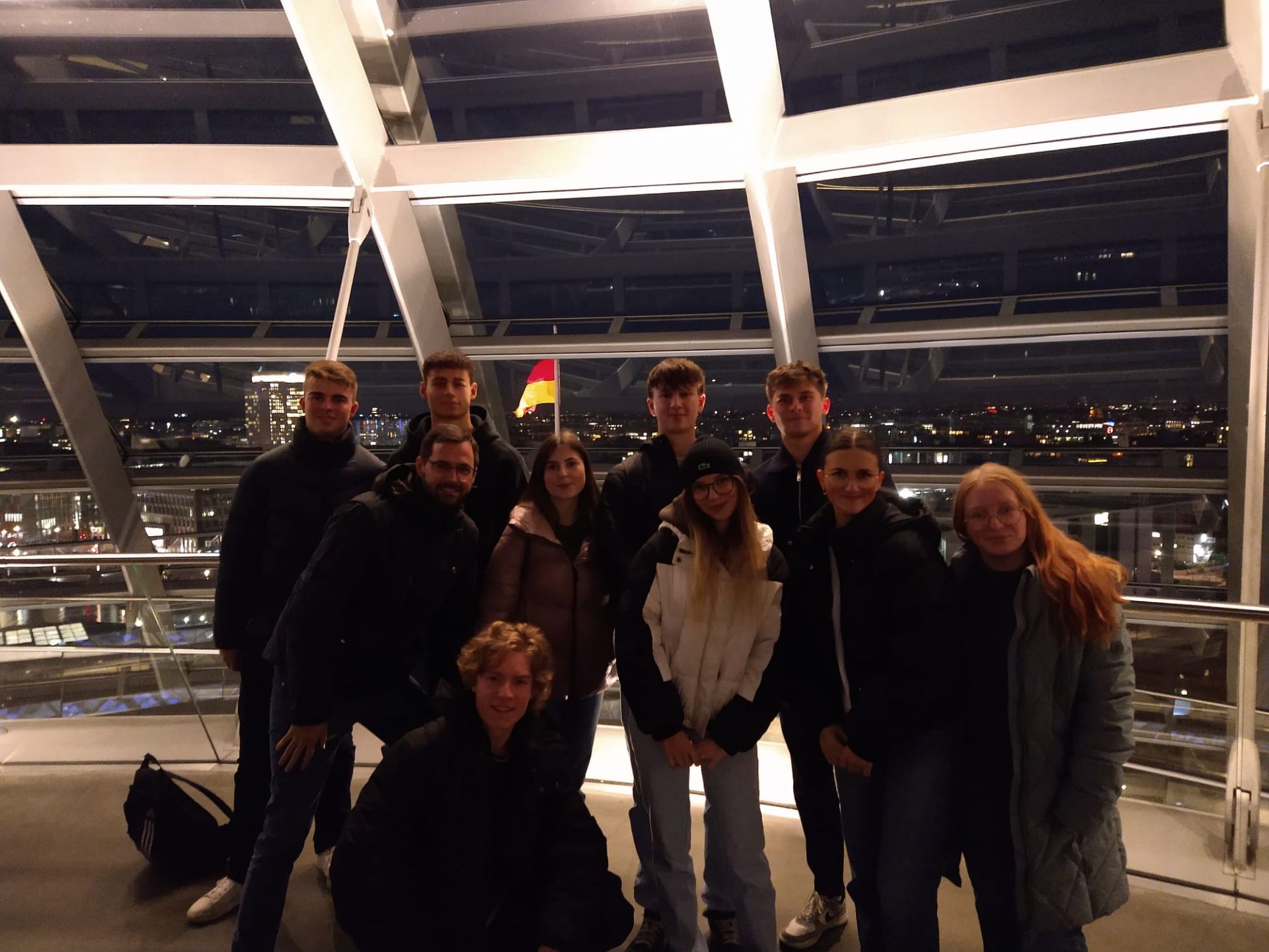 ZurückDienstag, der 11.11.2025. Früher als sonst klingeln die Wecker der Schüler des Politik Leistungskurses von Herrn Dr. Christ. Schnell nach Böblingen, Endstation Berlin. Spätestens als der Zug am frühen Nachmittag am Hauptbahnhof ankommt, verschwindet der letzte Rest der Müdigkeit und weicht einer Mischung aus Nervosität, Erwartung und Vorfreude. Nach einer kurzen Zusammenkunft im Hotel kann es auch direkt losgehen. Am selben Tag noch laufen wir gemeinsam durch die in das Licht der untergehenden Sonne getauchten Straßen Berlins. Am Brandenburger Tor angekommen, ist es bereits dunkel; so lohnt sich der Anblick des von goldenen Scheinwerfern beleuchteten Monuments besonders. Schnell noch ein Gruppenfoto und weiter geht’s. Essen gehen, den Abend genießen, ehe das Hostel mit einer Mütze Schlaf lockt.